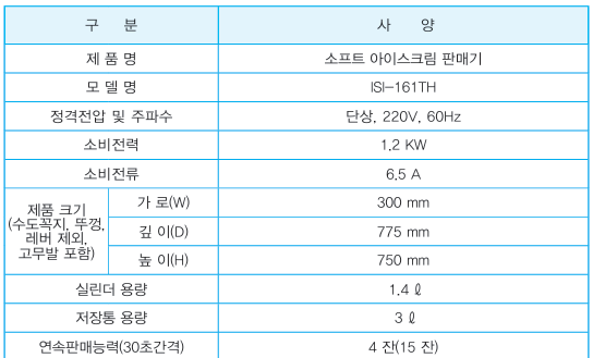 가장 많이 판매되는 아이스크림기인 아이스트로의 ISI-161 모델의 경우 제조사에서 배포하는 설명서에는 실린더가 1.4리터이고, 연속 판매 능력은 4잔이라고 나옵니다.