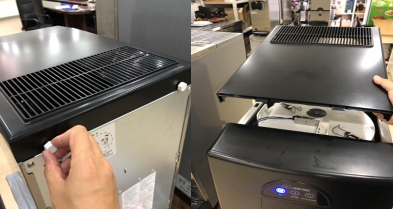 먼저 제품 상단의 탑커버를 열고, 얼음 보관통의 나사 및 클램프를 풀어줍니다.