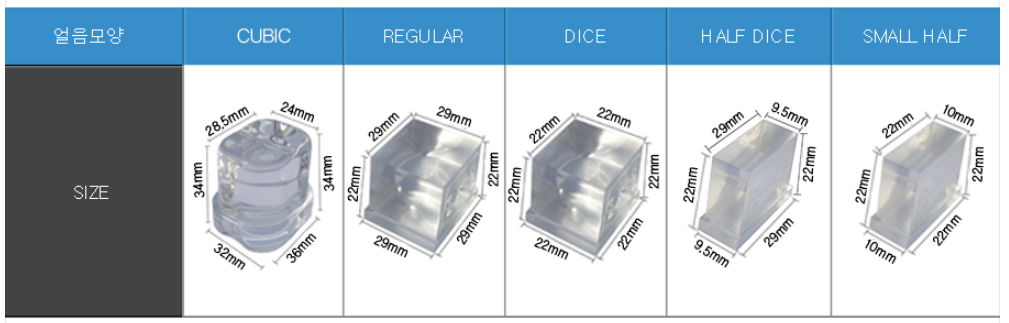 먼저 일반 카페나 식당에서 아이스음료를 만들 목적이라면 큐빅타입이나 버티컬 타입의 얼음형태를 선택하시는 것이 좋습니다. 큐빅타입은 얼음 모양이 종모양으로 생긴 얼음으로 물을 아래에서 위로 분사하여 만드는 방식입니다. 대량생산은 구조상 힘들수 있으나 얼음 결정체가 맑고 단단한 것이 특징입니다. 버티컬 타입의 얼음은 주로 사각형의 얼음은 말하는데 아래 그림에서 보시면 레귤러 사이즈, 다이스 사이즈, 하프 사이즈 등등 다양한 사이즈가 있으니 참고하시면 좋을 듯 합니다.