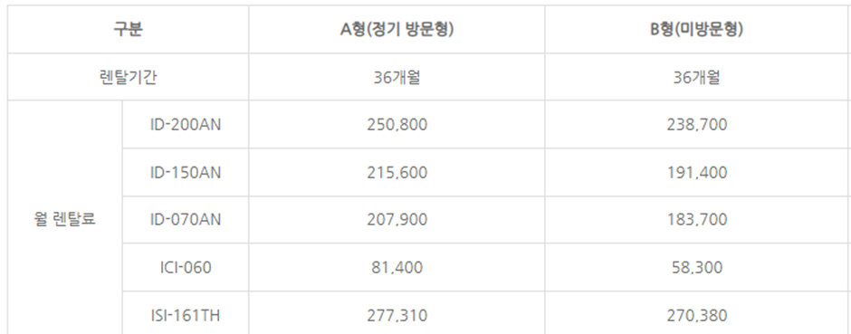 계약 기간 36개월 동안 무상 AS가 가능하며, 계약 이후 소유권은 사용자에게 이전됩니다. 렌탈료는 아래 표를 참고하세요. 법인 및 대량 주문건은 별도 상담이 가능합니다.
