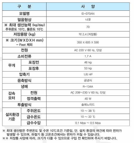 ID-070AN 디스펜서형 제빙기는 일일 생산량이 약 70kg이며, 저장용량은 2.4kg 입니다. 얼음 형상은 너겟 모양으로 카페에서 보는 큰 얼음은 아닙니다. 이는 기기의 특성상 작은 형태의 얼음만 생성이 가능하기 때문입니다.