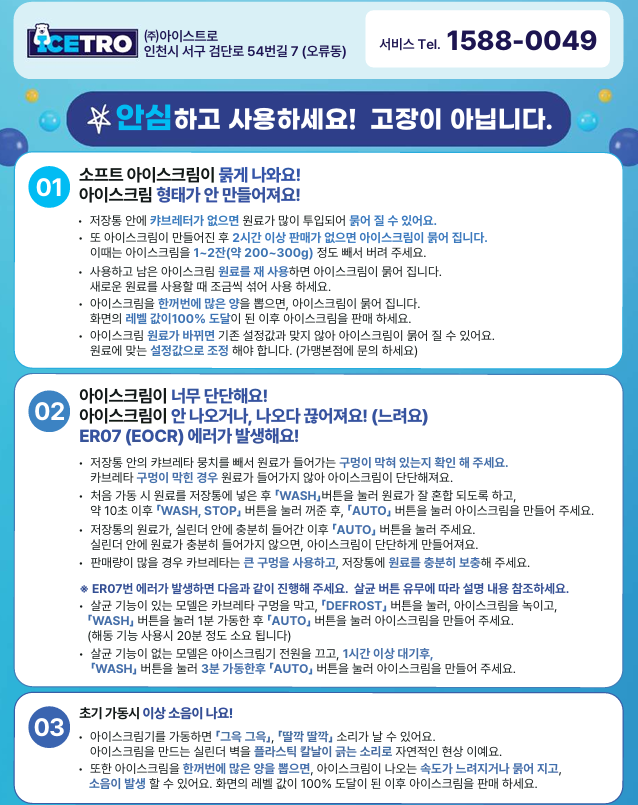 안녕하세요. 25년 기준 아이스트로 제빙기 매뉴얼(사용설명서) 입니다. 1. ICI-060(W) / ICI-100(W) / ICU-150W 2. ICI-043 / JETICE-043 / JETICE-070 / ICETRO-070W / JETICE-110 / JETICE-130 / JETICE-150 3. IM220 / IM260 / IM350 / IM500 / IM1000 4. JETICE-210(W) 5. ICI-60VF / ICI-60VHF 6. ICI-100VADS (VADL, VAHS, VAHL, VWDS, VWDL, VWHS, VWHL) 7. 디스펜서 ID-150AN 8. 디스펜서 ID-070AN 9. 디스펜서 ID-200AN 10. 눈꽃제빙기 (IIS-320SA) 11. IFI-070AN (A..